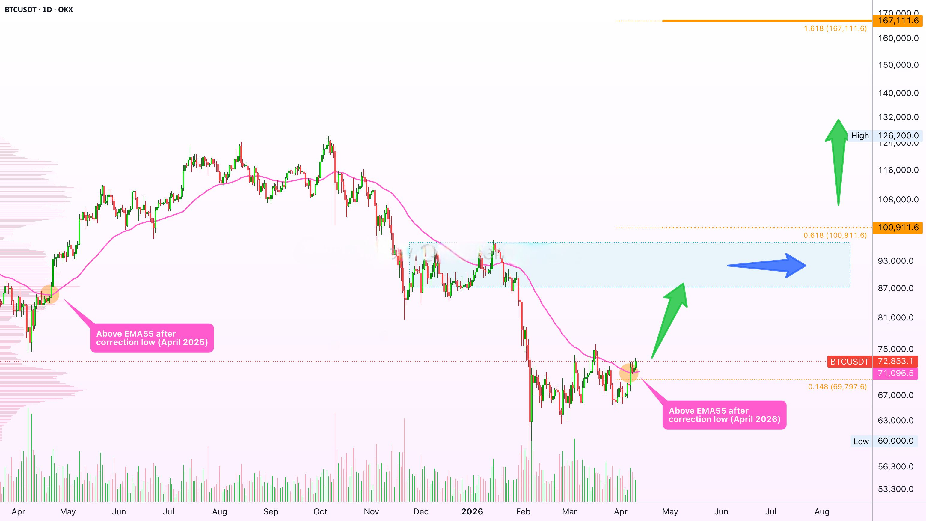 » BTCUSDT se moveu diariamente acima da EMA55 em abril de 2025 após uma grande correção baixa, acompanhada de um volume realmente alto. Isso sinalizou o início de um movimento em direção a um novo recorde histórico.