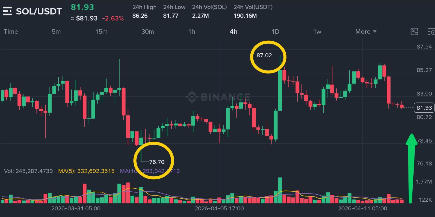 Solana rejeitou a $86,26 e retrocedeu para $81,93, agora segurando logo acima do suporte de $81,70. O gráfico de 4H mostra uma clara rejeição a $86,26—os vendedores defenderam esse nível. O suporte está em $81,70 e $80,70. A resistência está em $83,00 e $85,27. O volume foi de $190M, respeitável. O RSI está em 45, neutro com uma leve inclinação bearish.