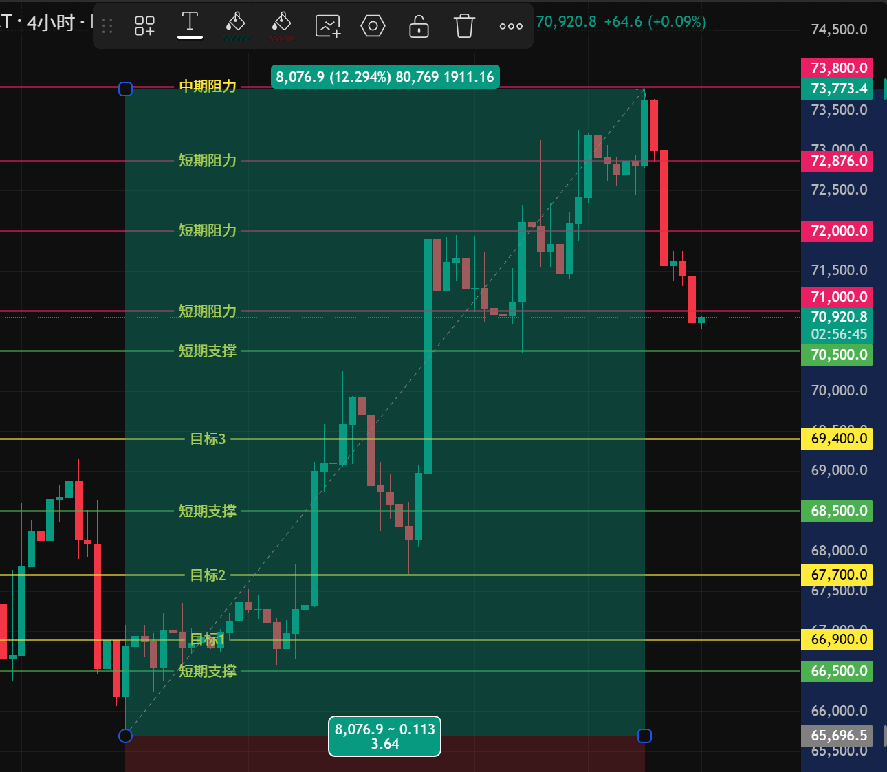 Atualmente, o preço está sendo mantido firmemente em torno de 70,730. Desconsiderando todo o ruído do mercado, vamos direto ao ponto com uma linguagem de negociação bem direta, desmontando a lógica subjacente dessa queda acentuada à meia-noite. Neste momento de pânico, mantenham a calma!