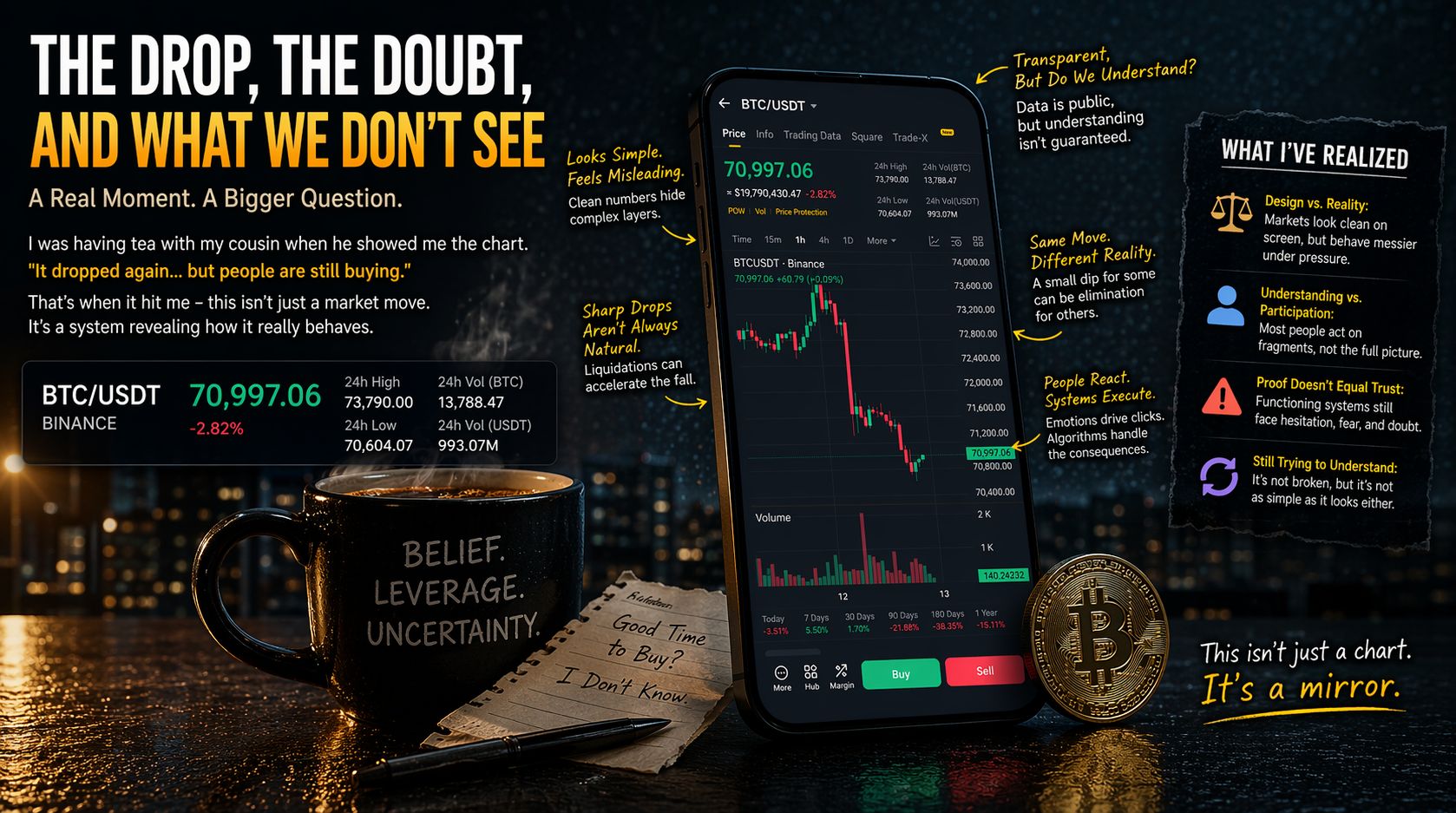 Não foi a queda em si que me incomodou. Os mercados caem o tempo todo. O que ficou comigo foi a estranha calma em sua voz, como se esse comportamento—essa contradição—já tivesse sido normalizado. Um sistema caindo, e ainda assim atraindo mais crença na queda.