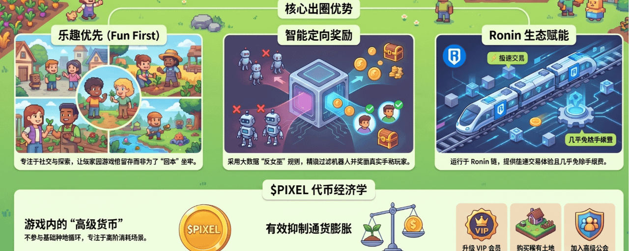 对抗性演练: 就像图中提到的,这需要数年的积累。Pixels 能识别出哪些是真实社交的玩家,哪些是定时定点种地的脚本。当大多数项目还在靠简单的验证码(Captcha)防守时,Pixels 已经通过“智能奖励定向”实现了降维打击。