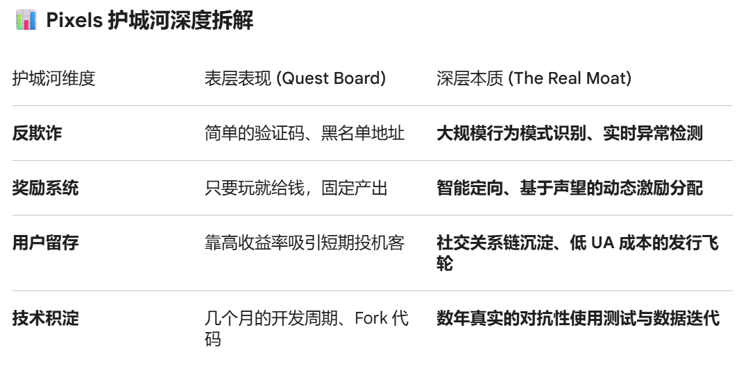如果把 Web3 游戏比作一座城堡,Pixels 的护城河由三层深水组成: