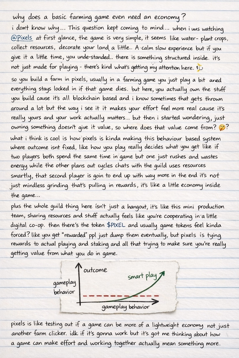 Eu continuo voltando a uma coisa: por que um jogo de agricultura precisa de uma economia em primeiro lugar? Porque quando eu olhei pela primeira vez para @Pixels , me pareceu super simples, apenas plantar coisas, coletar itens, arrumar sua terra, relaxar um pouco e sair. Essa é a superfície, pelo menos. Mas quanto mais eu assistia, mais sentia que havia algo mais sob toda aquela calma do jogo, e acho que isso ficou na minha cabeça. Joguei jogos suficientes para saber que a maioria deles não se importa realmente com seu esforço uma vez que você sai; você se esforça um pouco, ganha alguma recompensa, gasta e o ciclo se encerra, terminado, nada realmente fica com você. Mas aqui eu sinto que os pixels estão tentando esticar esse ciclo e fazer seu tempo dentro do jogo ter um pouco mais de peso.