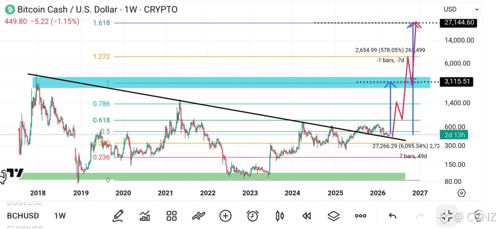 The analyst used Fibonacci extensions to outline future price targets. Key levels include 0.618, 0.786, 1.272, and 1.618 extensions. These levels suggest a gradual expansion in price over time. The Bitcoin Cash price could first move toward $3,110 based on this structure.