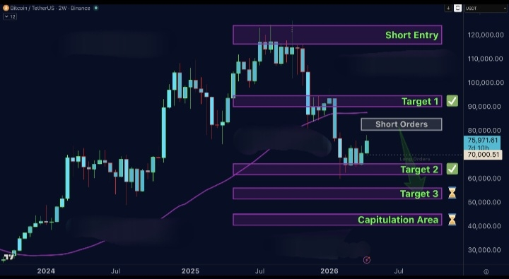 I can't believe that many are now calling that the bottom was in and the bear is over, or even worse that a new ATH is coming. To make it clear, Bitcoin remains in a strong bear market and what we see now is a relief rally within the bear market. Do you know that during the bear market in 2022 Bitcoin went from 68k to 33k almost straight down, then Bitcoin went up from 33k 45% to 48k before crashing down to 16k. Some people with a small IQ, and those who can't understand time frames can't understand this, this is why you notice a lot of comments such as "Weren't you bearish all the time?" "Now you are turning bullish". In fact, I have been calling for 79-84k since the 60s region, and always said it's not off the table and if the market allows to visit it I will short! So we entered spot at 68k once, and a long at 71k another time. If your brain struggles to hold two different timeframes at once, that is not a market problem! Bitcoin is moving within its box I shared in February 2026. Remember the line "Interested to Short here"? We are coming close to this area! And on top we are in a long since 71k and aiming for the targets of 79-84k region! Now I will add something new to the set-up and it's very important to understand this well: