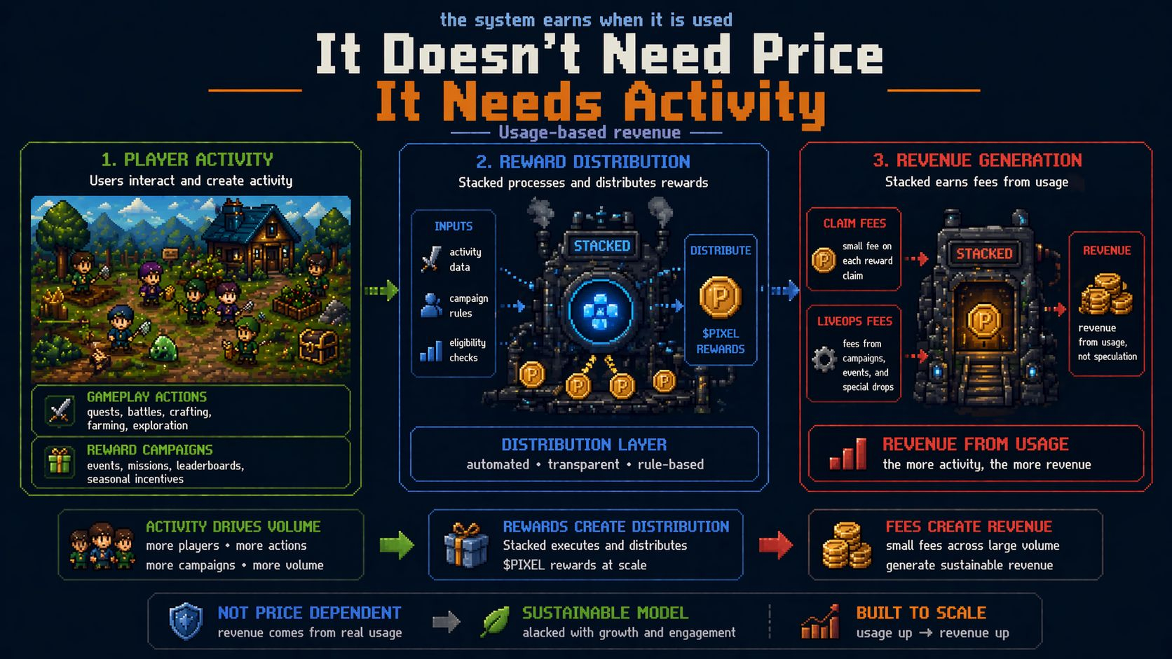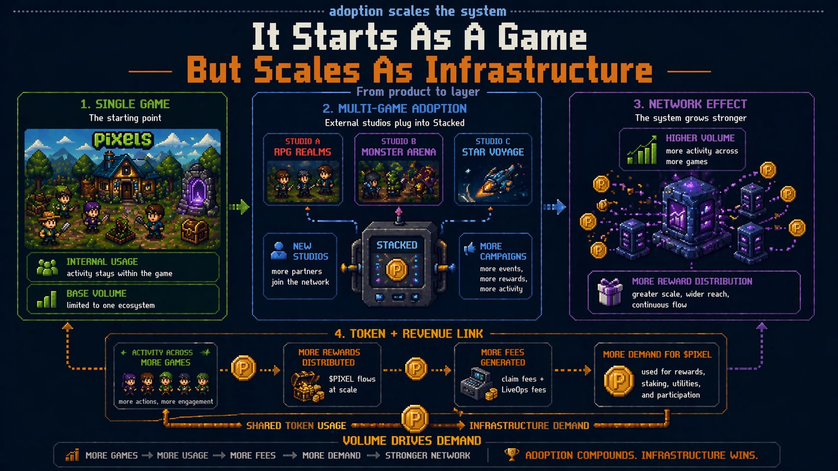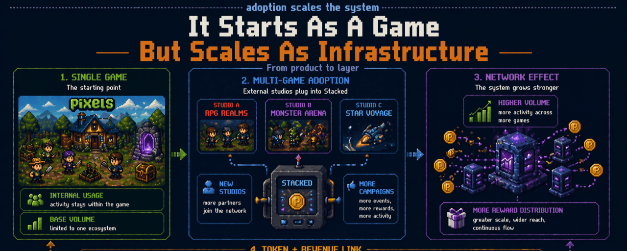 But the part that keeps me thinking is what happens when external studios come in. Because once Stacked is open beyond Pixels, every new studio using it does two things at the same time. They generate fee revenue for Stacked, and they create demand for PIXEL if they’re using it to run reward campaigns.