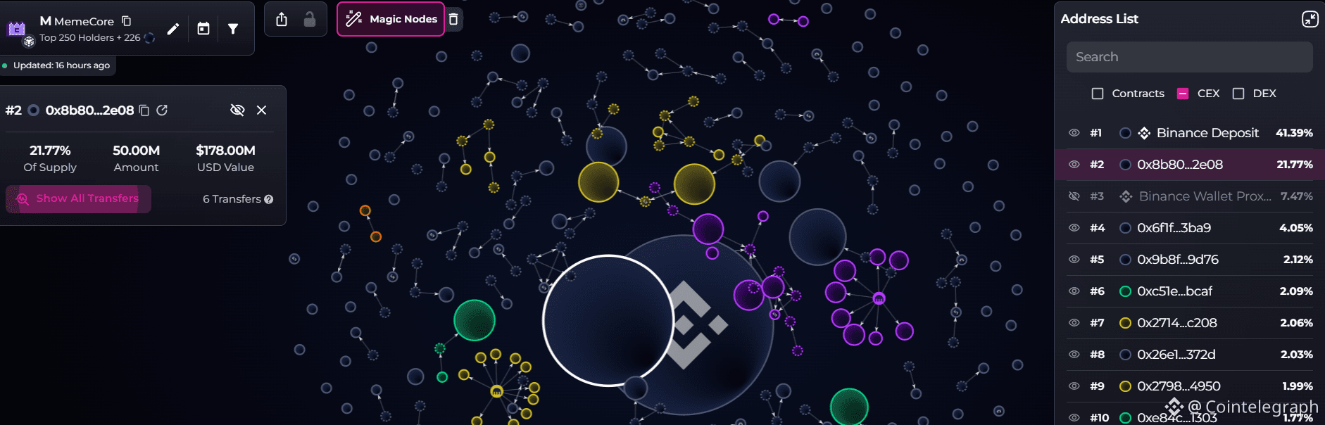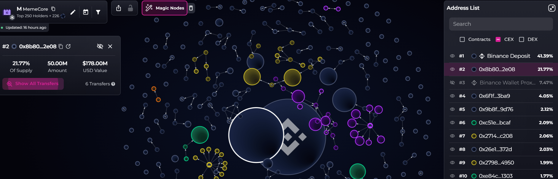 O segundo maior detentor, a carteira “0x8b8,” detinha 50 milhões de tokens M, atualmente avaliados em $178 milhões, representando 21,77% do suprimento, de acordo com a plataforma de visualização de dados da blockchain Bubblemaps, que listou o endereço de Depósito da Binance como o maior detentor com 41,3% do suprimento.