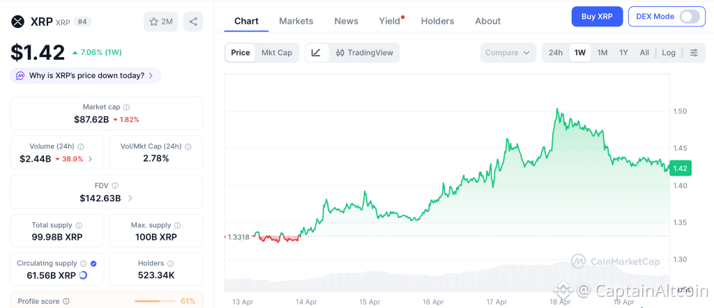 XRP trades near $1.42 after pushing briefly above $1.50 on April 17 for the first time this year, per CoinMarketCap.