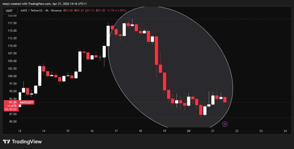 Uma análise da ação do preço da AAVE mostra um mercado reagindo a mais do que apenas um único exploit. A queda seguiu uma mistura de saídas internas, contratempos técnicos e um grande ataque externo que afetou a liquidez em todo o protocolo.
