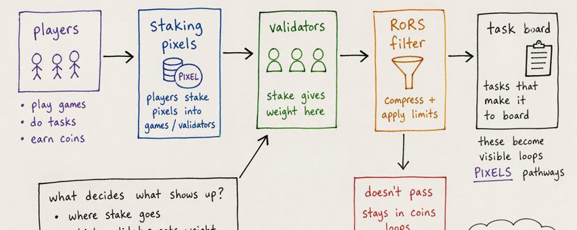then it gets heavier because its not only the game doing this. its players too. players are the ones sending stake into validators and that means players are also part of deciding what gets enough weight to survive and what doesnt. what gets seen what gets tasks what gets pushed into actual pixel paths and what just stays stuck in coin loops and never really becomes visible. thats the part that changed how i look at this whole thing, because now it doesnt feel like a simple game economy anymore, it feels like a filtered one where some things get the light and some things dont even get the chance