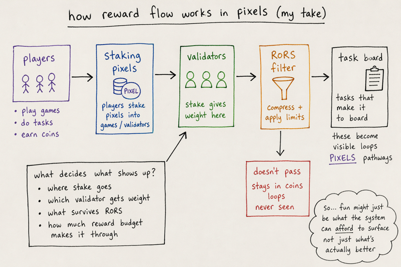 and i think thats the weird part no one really explains properly. you can still feel it though. pixels looks like this fun front layer where everything is visible and playable and easy to understand, but behind it i feel like there is this quieter system deciding what can stay alive long enough to actually matter. reward spend moves through validators through filters through limits and only some of it reaches me in a form i can actually play. so staking doesnt feel like some lazy yield feature anymore. to me it feels more like steering. like saying this gets weight this gets room this gets a chance to show up