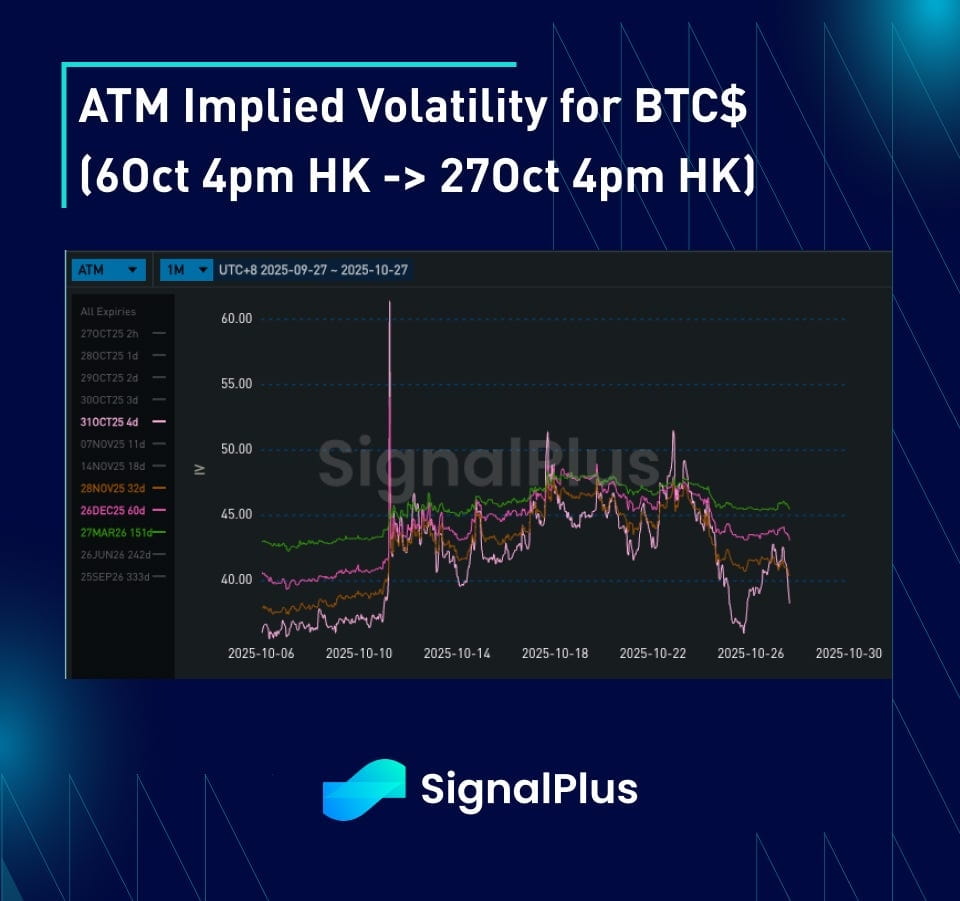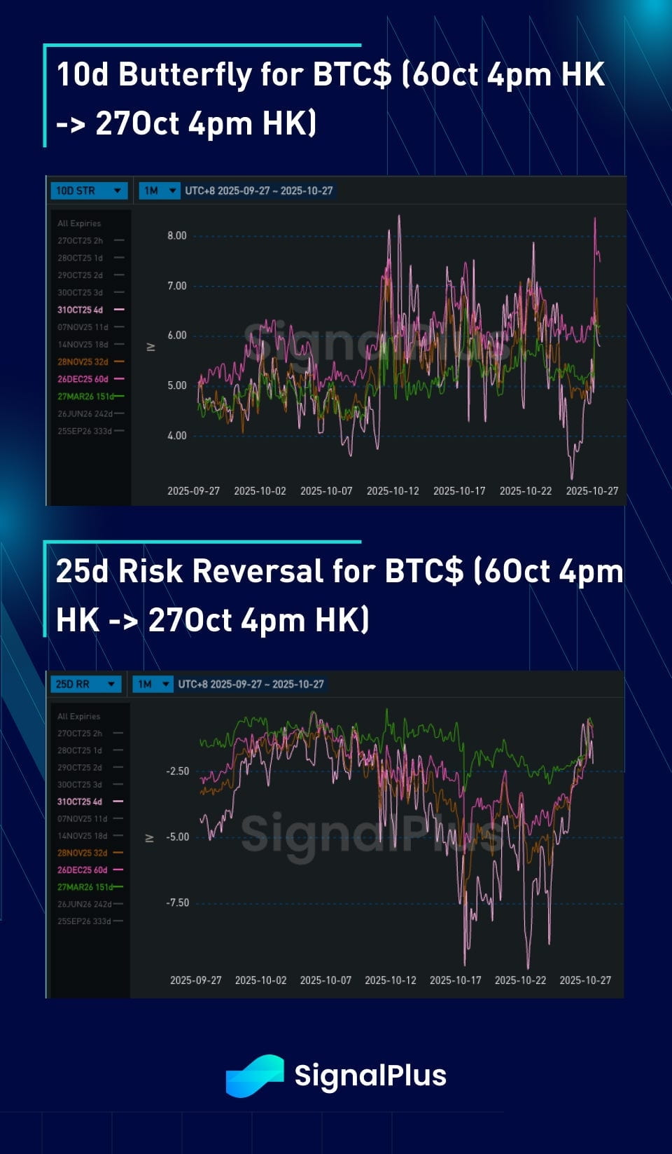 Os preços do skew recuaram de sua precificação profunda para puts à medida que os medos de uma queda abaixo de $100k diminuíram com o sentimento positivo de risco sobre os EUA-China neste final de semana, ajudando a apoiar o spot de volta acima de $115k. Dito isso, no final, a dinâmica do skew se comportou de maneira incrivelmente forte, com a volatilidade implícita e realizada muito mais alta em um spot mais baixo, e tanto a volatilidade implícita quanto a realizada começando a estagnar enquanto nos recuperamos lentamente. Como tal, a precificação da reversão de risco que favorece puts deve estruturalmente permanecer intacta, embora deslocamentos de curto prazo em torno desse 'nível justo' sejam possíveis.