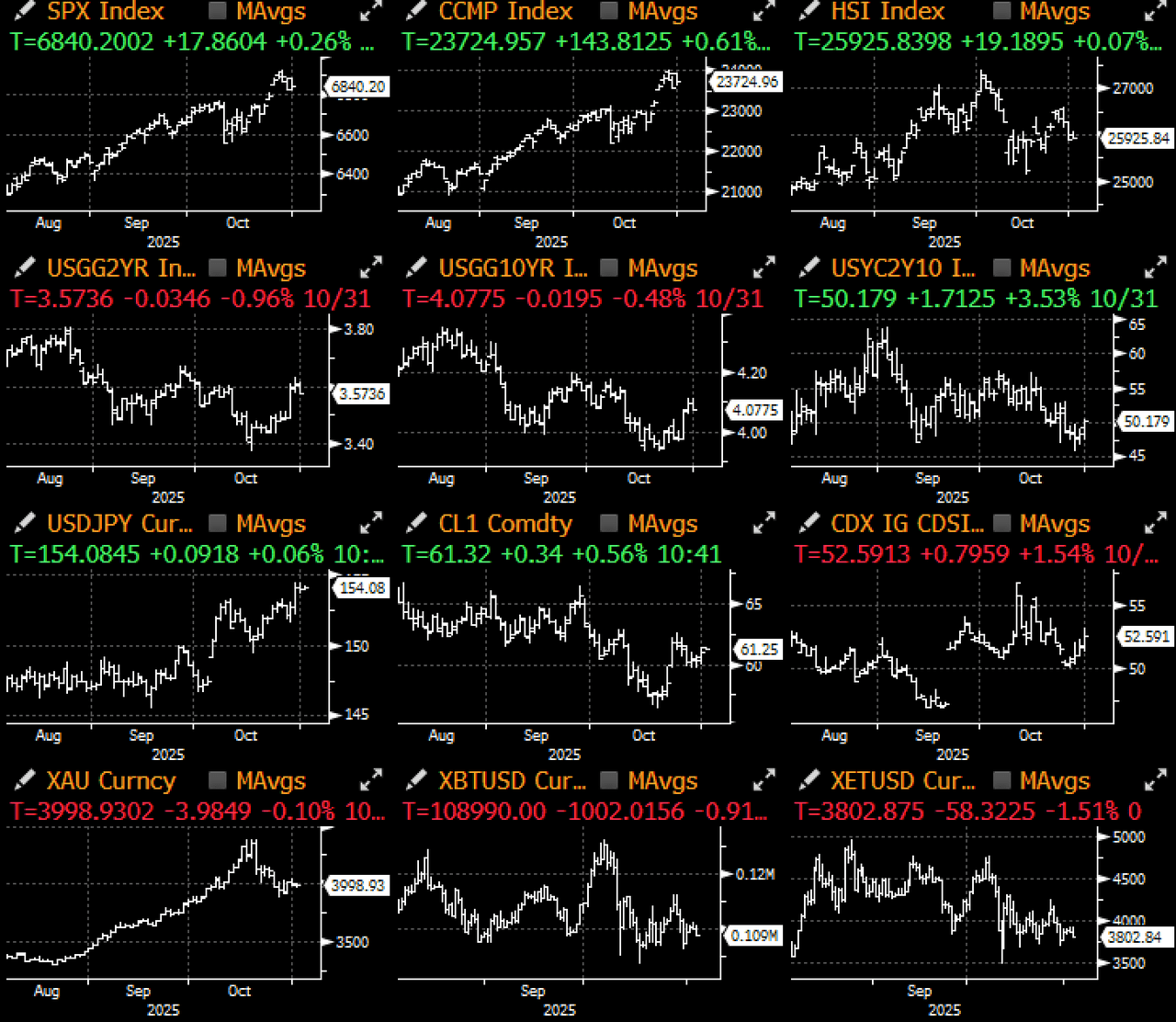 Dado os níveis de preços elevados, os ativos de risco ficaram decepcionados com a falta de alívio imediato, as ações dos EUA caíram 1–2% desde o ATH desde a reunião, as chances de corte de taxa em dezembro caíram para cerca de 70% após uma probabilidade quase certa de ~95% antes da reunião.