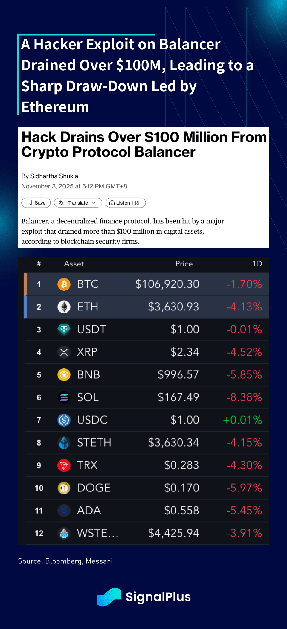 Diferentemente das ações, que efetivamente estiveram presas em modo ‘apenas para cima’, os preços das criptomoedas foram espancados e o sentimento caiu para novas mínimas. O poder de compra da comunidade e o otimismo despencaram com as recentes quedas de preços, com as repercussões totais ainda não claras, e estávamos mal preparados para outro movimento que desestabilizasse a confiança, com o Balancer hackeado por mais de $130M durante a noite. O Ethereum despencou quase 10% com o movimento, com a fé no DeFi mais abalada do que nunca, dado o status de ‘OG’ do Balancer como um dos protocolos seguros do sistema. Além disso, isso está acontecendo em meio a rumores circulantes de que podem estar sendo tomadas ações regulatórias após a queda de 10 de outubro entre alguns dos maiores players do mercado, o que aumentou as tristezas gerais e levou o BTC perigosamente perto da área de $105k.