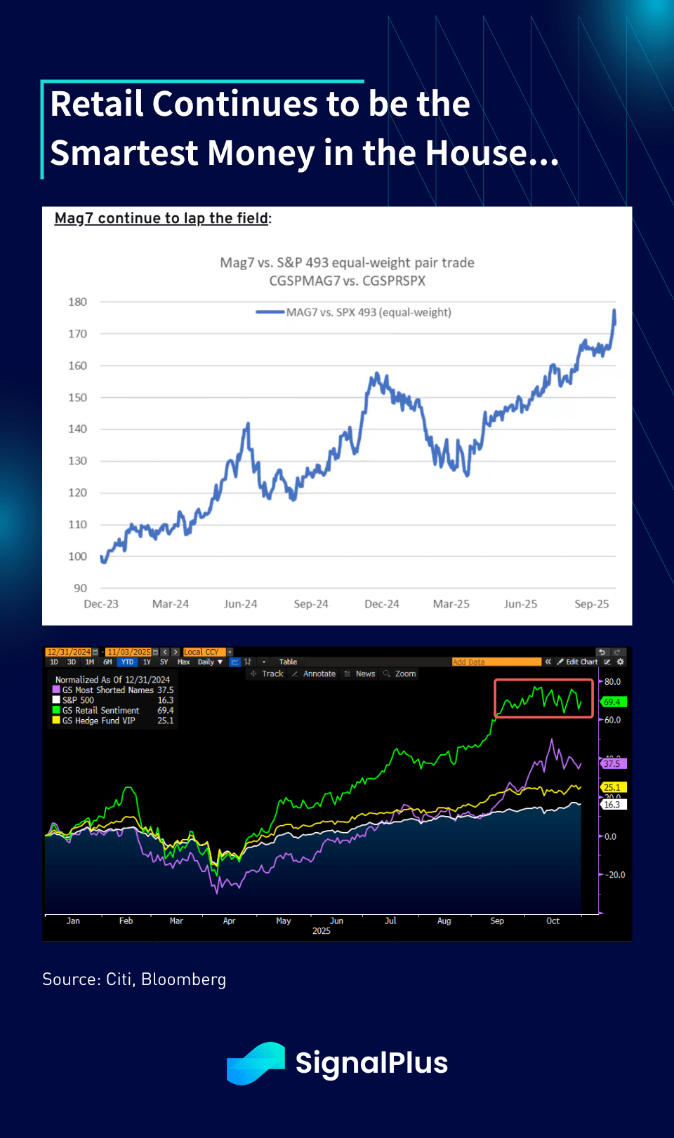 Apesar do pequeno retrocesso, o sentimento geral permanece otimista à medida que nos aproximamos dos lucros, com ações de EM na Coreia e no Japão liderando a carga no desempenho da Nvidia e dos semicondutores. As ações ‘Mag-7’ continuam a liderar o campo com uma superação de 70% em relação ao benchmark em uma base de 2 anos, com a cesta ‘favorita do varejo’ também superando quase todas as estratégias até agora.