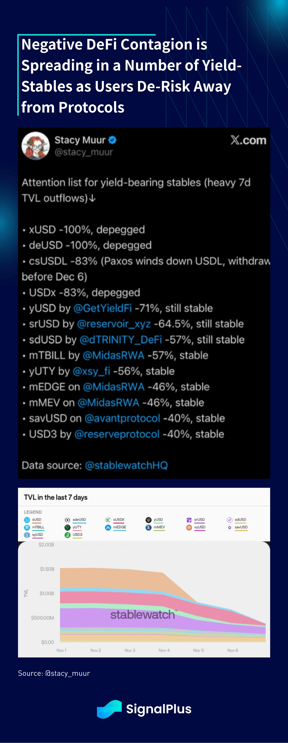 Além disso, à medida que mais vítimas do colapso de 10/10 continuam a surgir, estamos vendo um aumento nas saídas de TVL e desagregações de stablecoins em vários protocolos de DeFi que geram rendimento, seguindo os desenvolvimentos infelizes na Stream Finance.