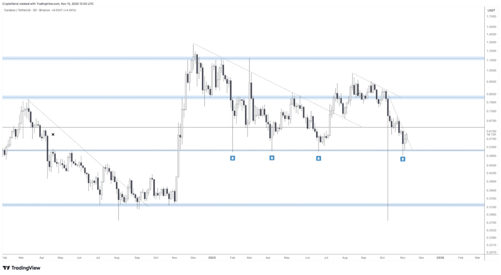 Cardano (ADA/USDT) está desafiando sua resistência local à tendência de baixa no gráfico de 3 dias. O ADA formou uma série de máximas mais baixas desde meados de 2025, indicando pressão de baixa contínua no mercado.
