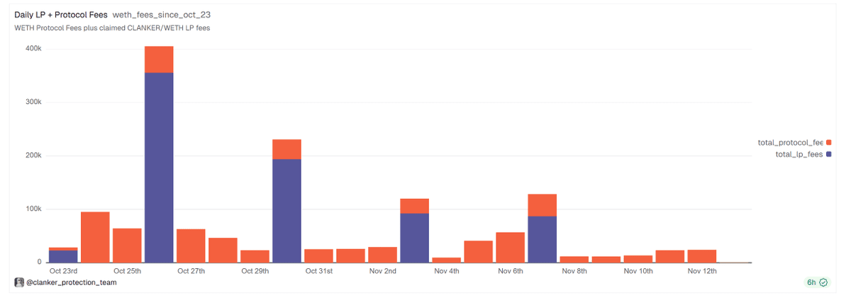 Entre 23 de outubro e 13 de novembro, a receita do protocolo Clanker foi de aproximadamente 1,58 milhões. A receita anualizada é de cerca de 28,8 milhões. Desses, 2/3 serão usados diretamente para recompra do Clanker, resultando em uma estimativa de recompra anual de 19,22 milhões.