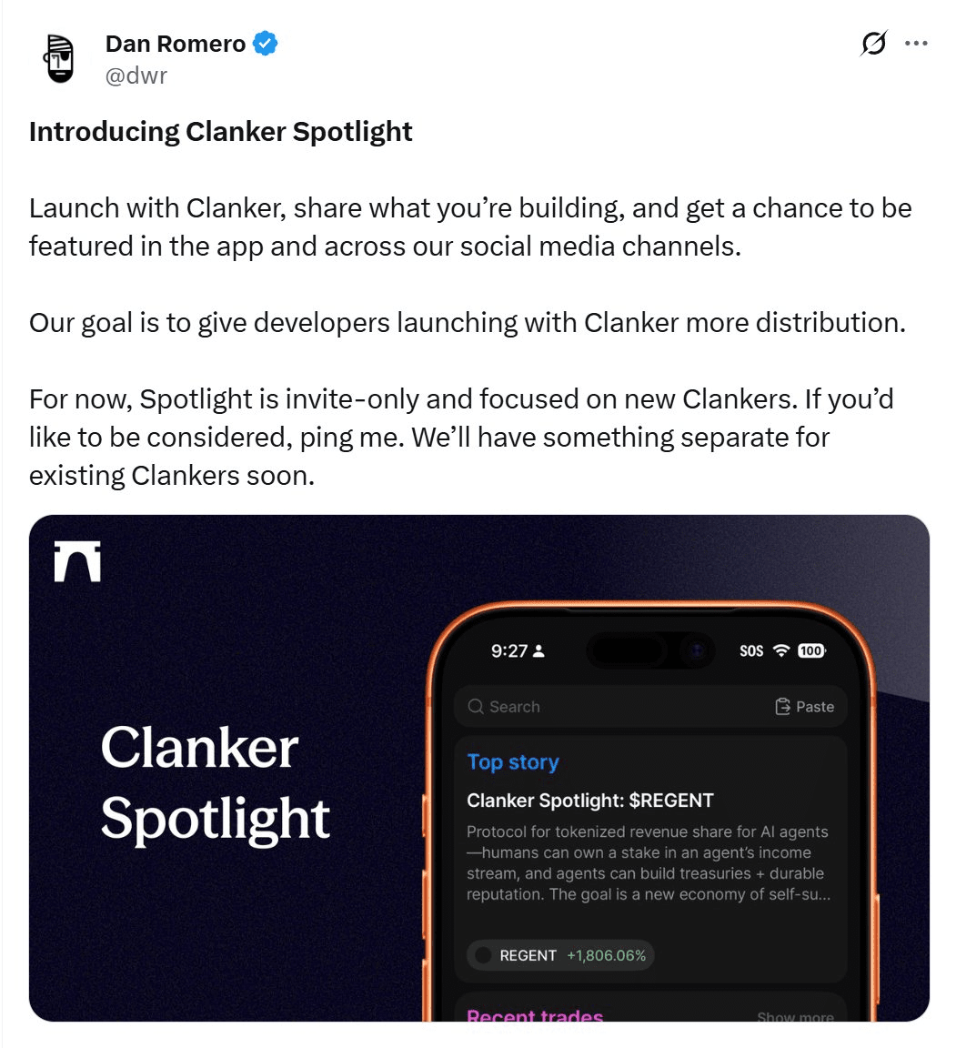 O Farcaster trouxe muito mais do que apenas mudanças na economia do token para o clanker. Na semana seguinte à aquisição do clanker, o Farcaster lançou a funcionalidade Clanker spotlight, oferecendo um espaço publicitário com alta visibilidade interna no aplicativo para projetos de qualidade lançados no Clanker.