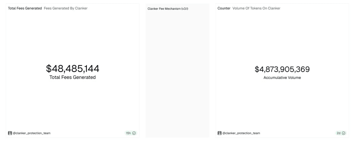 No ano seguinte ao lançamento, o Clanker totalizou 4.873.905.369U em transações, cobrando um total de 48.485.144U em taxas de protocolo (note que parte das taxas são cobradas em tokens do projeto, e cerca de 40% são receitas dos criadores).
