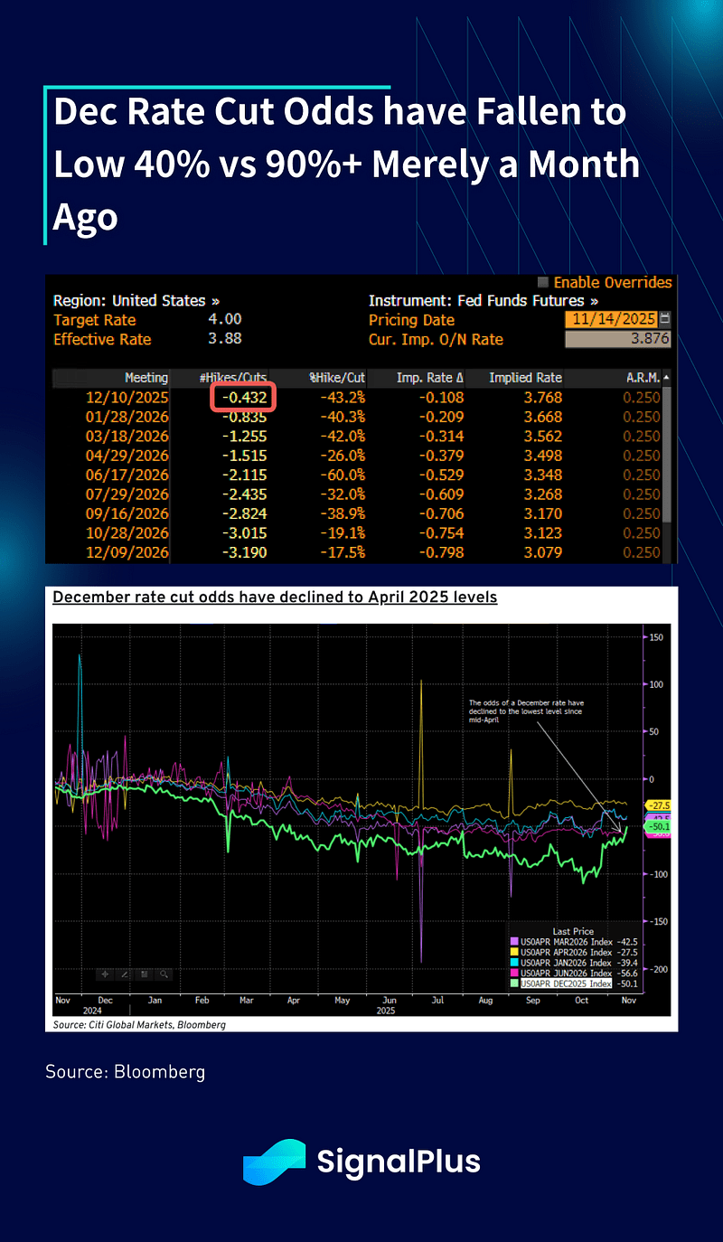 Nos EUA, as probabilidades de corte de taxa em dezembro caíram para 40% à medida que os funcionários do Fed têm saído em força para gerenciar as expectativas de afrouxamento, com a economia dos EUA ainda se mantendo em grande parte, apesar de algumas preocupações sobre o mercado de trabalho. A maior preocupação continua sendo com a inflação, onde o presidente Trump recentemente sofreu um revés significativo nas pesquisas devido à alta inflação e preocupações com o aumento do custo de vida, com a ex-secretária do Tesouro e presidente do Fed, Yellen, declarando que os EUA estão “em perigo de se tornar uma república das bananas”.