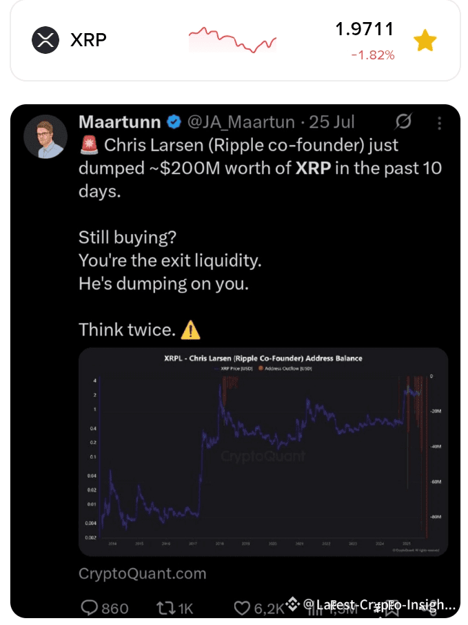 O cofundador Chris Larsen silenciosamente vendeu $200M em XRP em julho e mais $50M em outubro, e o gráfico nunca se recuperou.