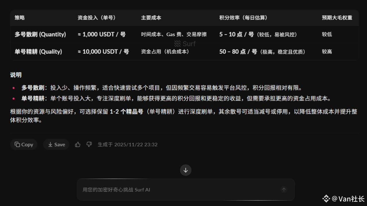 Abaixo está uma comparação da eficiência de custo para acumulação de pontos Alpha baseada na situação atual do mercado pelo Surf AI:
