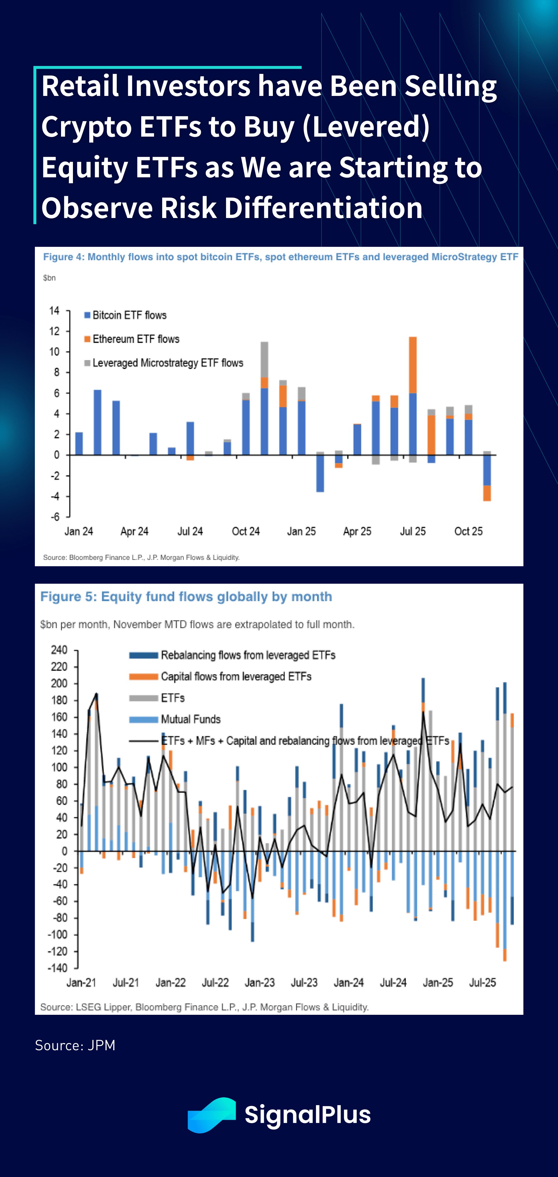 Com BTC e ETH apresentando desempenho inferior ao ouro e às ações entre 30% e 60% no acumulado do ano, os fluxos de ETF se tornaram negativos, com novembro registrando as piores saídas MTD em ~5bln entre BTC e ETH. Em contraste com as ações, que viram mais de $96bln de entradas de ETF MTD, é interessante notar que os investidores de varejo estão começando a diferenciar entre riscos de cripto e ações, com a venda do primeiro convertendo-se em compra do último.