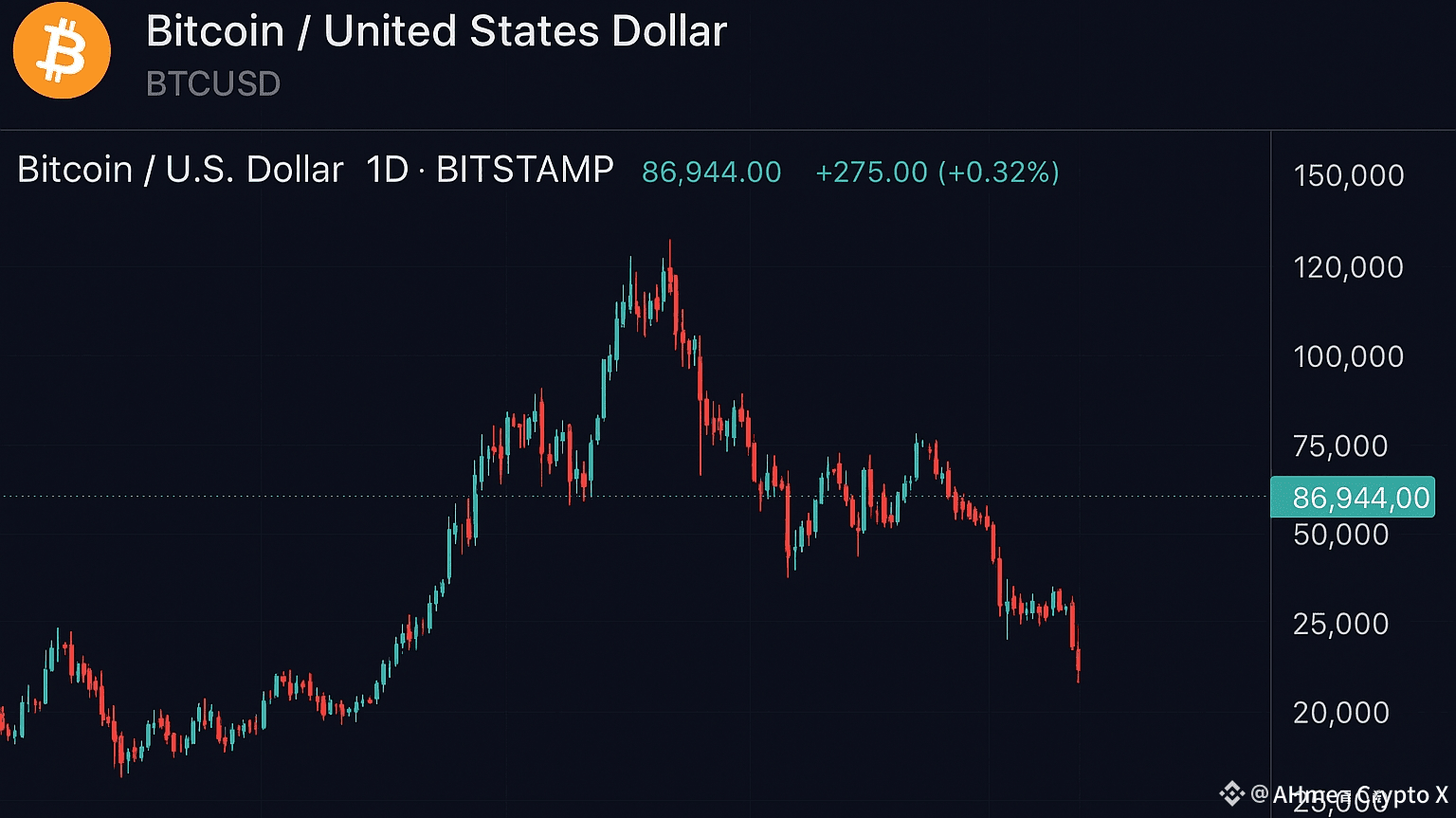 $BTC caiu recentemente da faixa de $120,000+ e agora está se estabilizando em torno de $87,000.