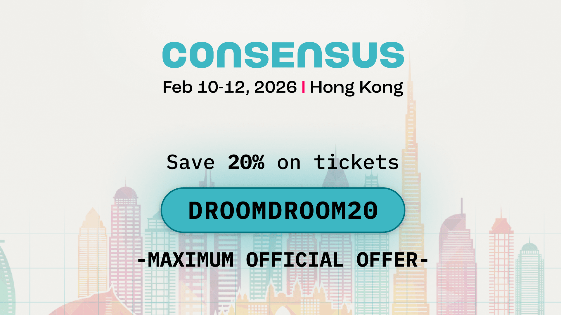Use DROOMDROOM20 para desbloquear o máximo desconto disponível para o Consensus Hong Kong 2026.