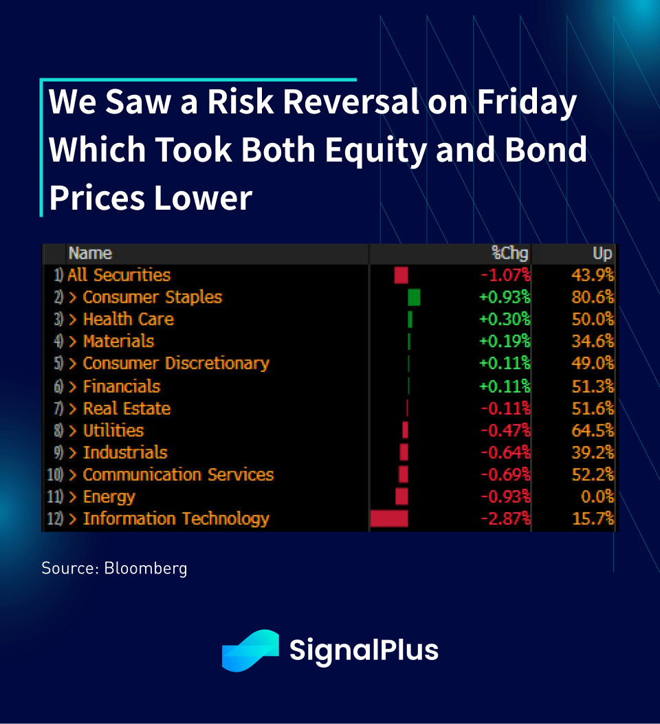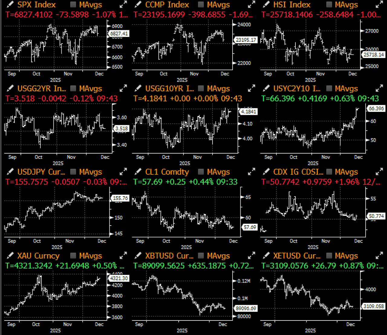 O sentimento de risco fez uma virada de 180 graus na sexta-feira, à medida que os ativos macro se desvalorizaram em toda parte, liderados por uma fraqueza significativa nas ações de tecnologia com um acentuamento da curva de rendimento. Preocupações com os lucros da Oracle e da Broadcom arrastaram o complexo de risco geral para baixo, enquanto a realização de lucros no final do ano e a rotação setorial arrastaram o Nasdaq para baixo em -2% intraday em um determinado momento.