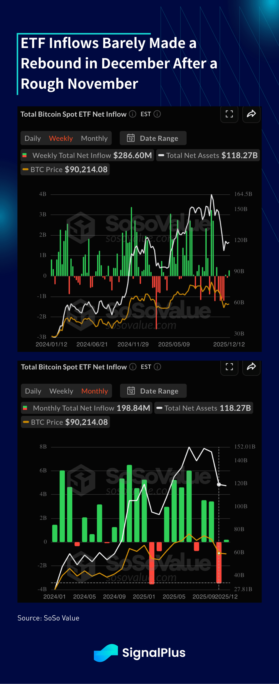 Com os mercados globais prestes a entrar no modo de férias, a natureza 24/7 do cripto pode ser um detrimento à medida que nos aproximamos do final do ano, com movimentos de preços provavelmente exacerbados, particularmente em mais movimentos de aversão ao risco e desinvestimento. As entradas de ETF fizeram uma leve recuperação na semana passada, após semanas de saídas, com os números acumulados de dezembro chegando a +0.2B em comparação a -3.5B no mês passado.