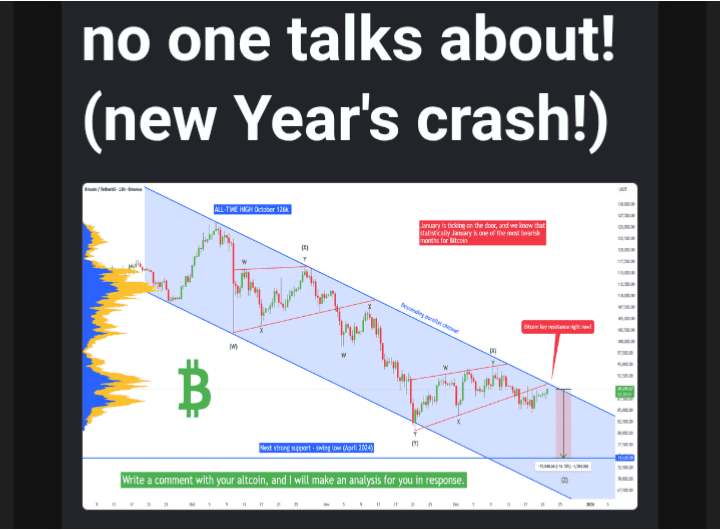 O que vemos no gráfico é um canal paralelo azul descendente. Este canal é o padrão atual que jogamos no Bitcoin neste período de tempo. Como o preço está dentro do canal e perto da resistência da linha de tendência, não podemos ser otimistas neste momento. O que os traders devem entender é que vendemos uma resistência e compramos um suporte, não o oposto. Atualmente, o preço está em uma zona de venda em torno de 90k - 91k no topo do canal. Ainda há um FVG não preenchido em 91k - 92k que atua como uma forte resistência. Janeiro está se aproximando, e sabemos que estatisticamente janeiro é um dos meses mais baixistas para o Bitcoin. Atualmente, não vejo nenhuma razão para ser otimista, então preciso permanecer baixista neste momento.