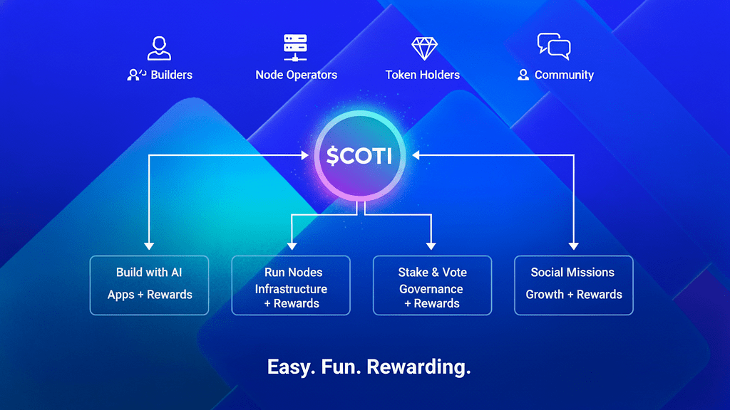 Em 2026, a COTI está elevando a forma como recompensamos todos em nossa comunidade, desde construtores até detentores de tokens. A COTI garantirá que adotemos uma abordagem equilibrada e sensata para recompensas que aumente o valor da rede, honrando os detentores, enquanto criamos um ecossistema de recompensas vibrante.