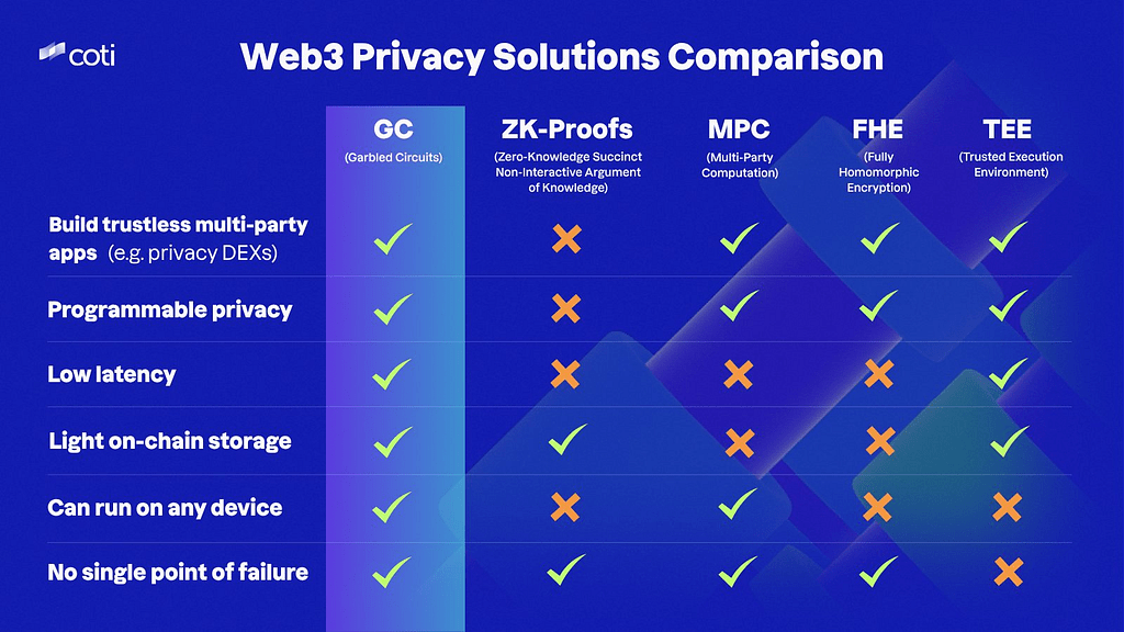 A COTI é o único protocolo ativo hoje, impulsionando ativamente a privacidade em vários casos de uso. Nossa pilha de privacidade é a mais escalável, eficiente e econômica do setor, e a única suficientemente escalável para atender à demanda global por privacidade para empresas, instituições e desenvolvedores.