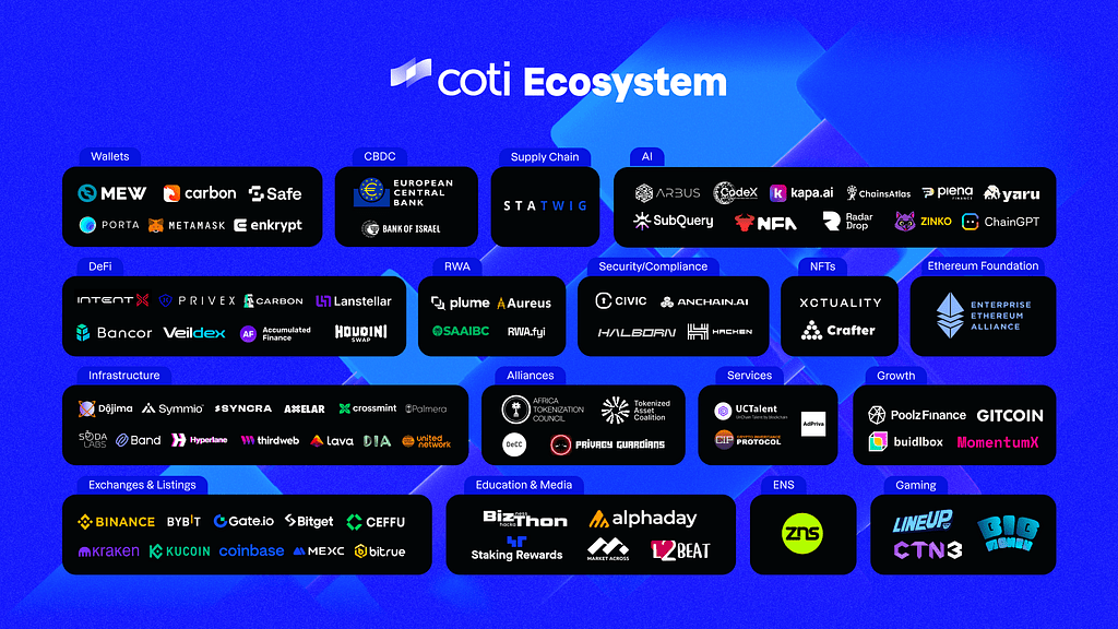 Grandes empresas como MEW, Plume, Bancor, Band, ChainGPT e Crossmint se juntaram ao ecossistema, abrangendo carteiras, tokenização, oráculos e desenvolvimento sem código, mostrando uma adoção ampla e diversificada. Também emitimos 16 subsídios para novos projetos de privacidade para construir na COTI.