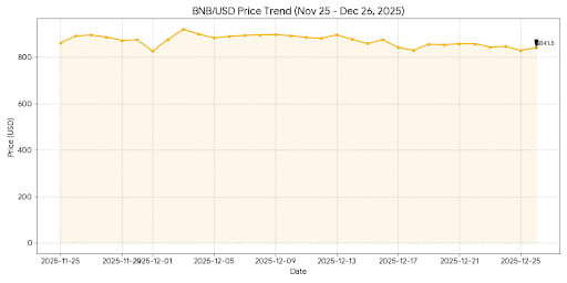 O BNB está atualmente sendo negociado em torno de $$841.50, refletindo uma recuperação significativa em relação ao seu menor valor mensal de aproximadamente \$826 no início de dezembro. No entanto, ainda está bem abaixo de seu pico do ano até agora de \$1,373.