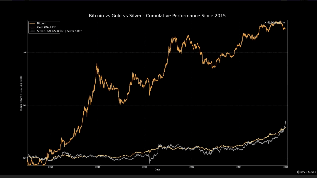 Desde 2015, o Bitcoin ($BTC) teve um aumento impressionante de +27.701%, superando dramaticamente os tradicionais reservas de valor. No mesmo período, a prata subiu apenas +405%, enquanto o ouro ganhou +283%.