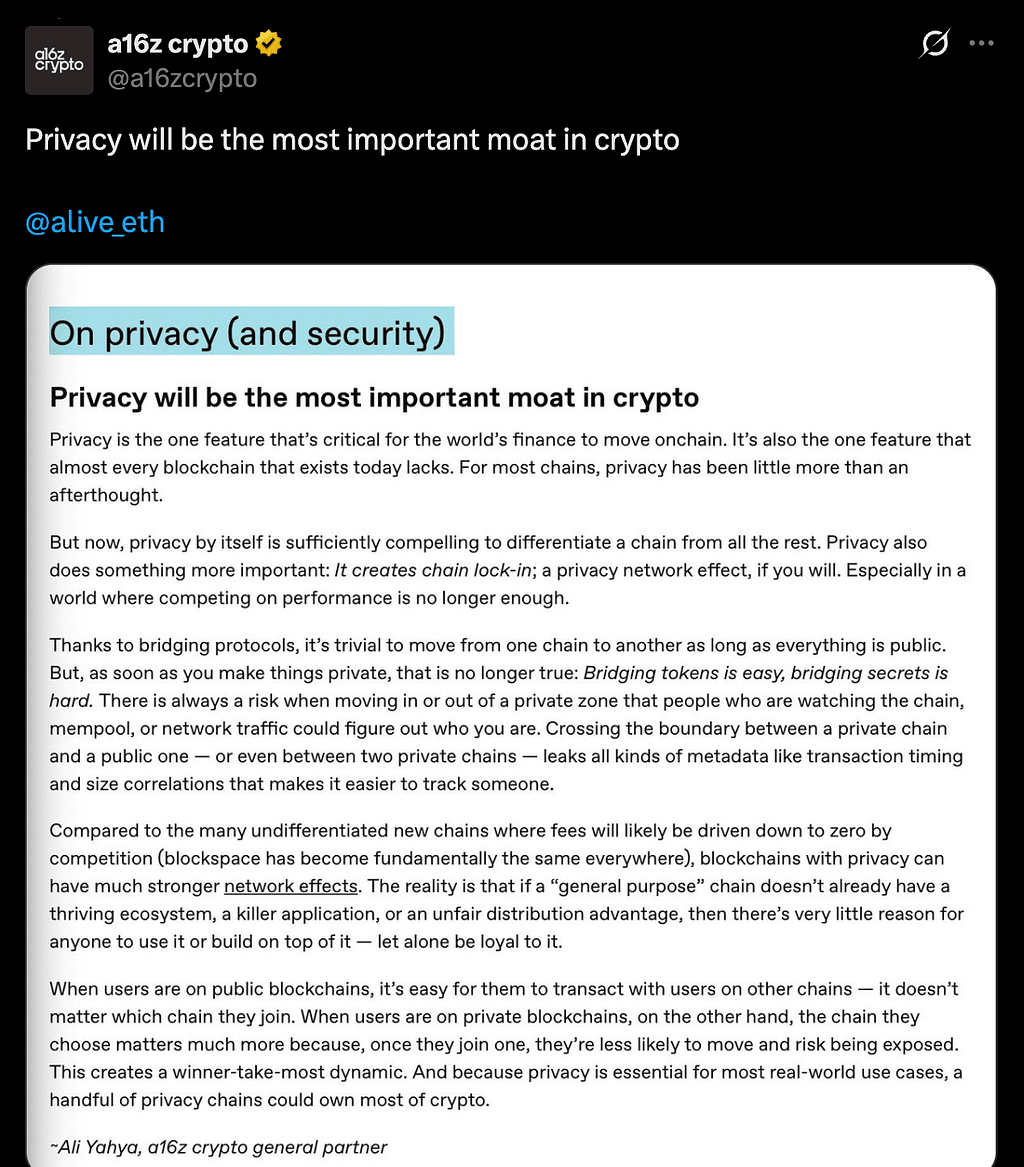 A indústria cripto está entrando em uma transição decisiva. À medida que a inovação tecnológica converge com a adoção global, a discussão em torno da privacidade está evoluindo rapidamente de uma preocupação de nicho para um pilar central da próxima era em blockchain. De acordo com análises recentes da a16z e do The Block, a privacidade está emergindo como a narrativa definidora que molda o futuro dos ativos digitais.