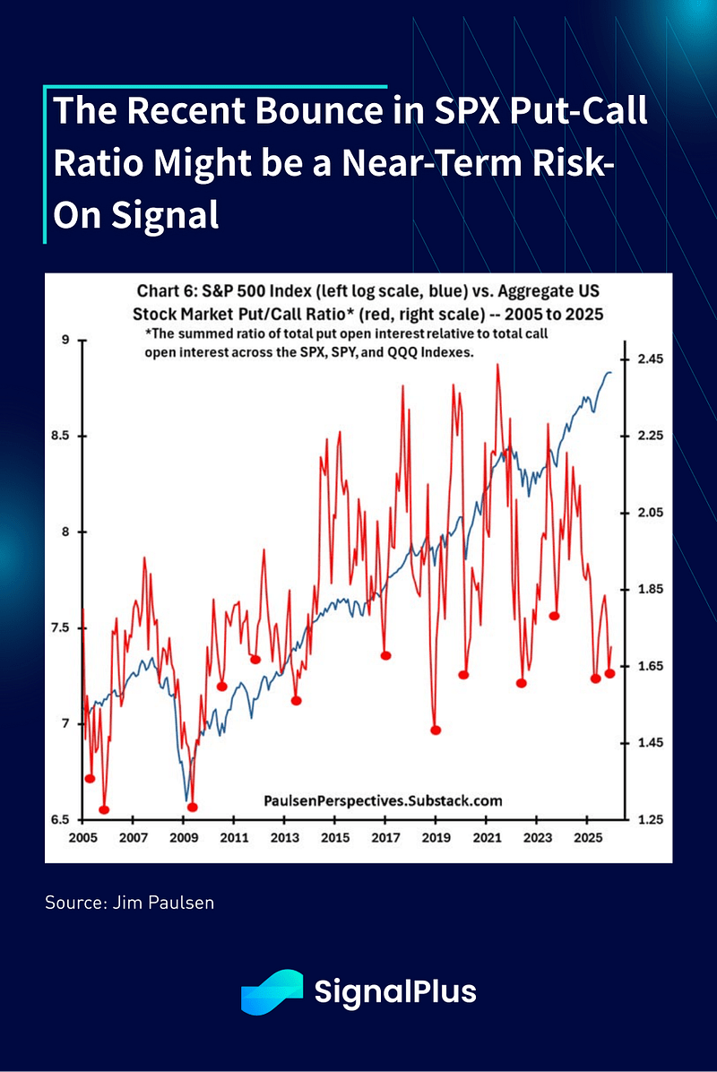 Segundo, apesar dos fluxos esmagadores, as razões put/call no SPX têm flutuado nas mínimas (cauteloso) à medida que o índice continuou a fazer novas máximas, e os saltos na razão (os pontos vermelhos) historicamente levaram a um forte período de risco para ações, um dos quais observamos em torno do final do ano. (crédito total ao trabalho do Sr. Jim Paulsen).