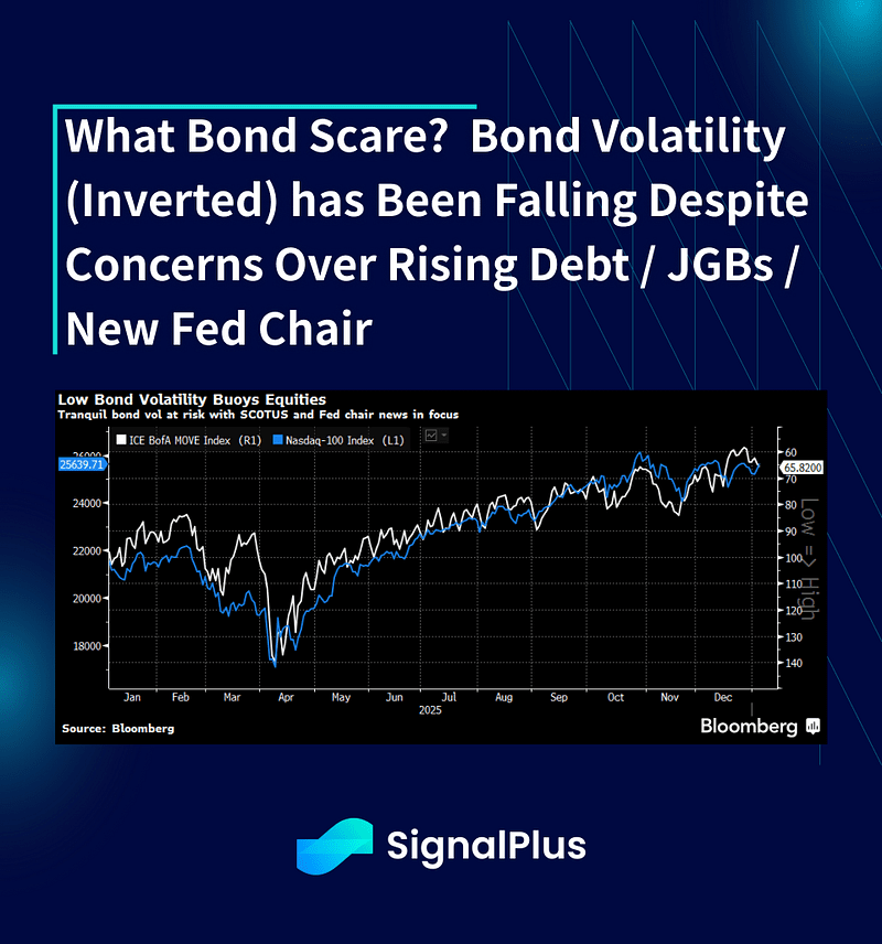 Finalmente, a queda da volatilidade e da correlação é outro indicativo. A correlação implícita continua a cair à medida que a amplitude das ações melhora, enquanto a baixa volatilidade macro está ajudando a impulsionar os preços das ações para cima. Apesar da habitual conversa apocalíptica sobre o aumento da dívida pendente e os rendimentos dos JGB, as volatilidades implícitas de renda fixa fecharam 2025 no menor nível em anos.