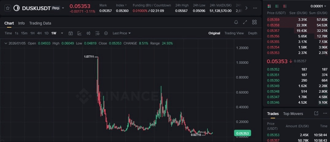 Se você olhar fixamente para o gráfico semanal de $DUSK por tempo suficiente, percebe algo interessante. Ele já não está gritando para chamar atenção. Sem picos selvagens. Sem colapsos dramáticos. Apenas o preço se movendo lateralmente, lentamente, quase de forma desconcertante.