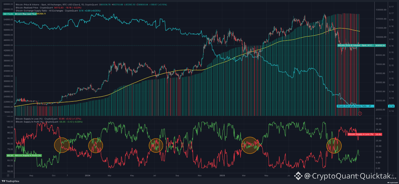This mid to long-term analysis combines price action with on-chain supply metrics to understand Bitcoin’s structural trend rather than short-term volatility. By using Realized Price, Exchange Supply Ratio, MA 209 (close), Spot Price & Volume, and Supply in Profit vs Supply in Loss, we can identify accumulation zones, trend strength, and risk areas for the average investor.