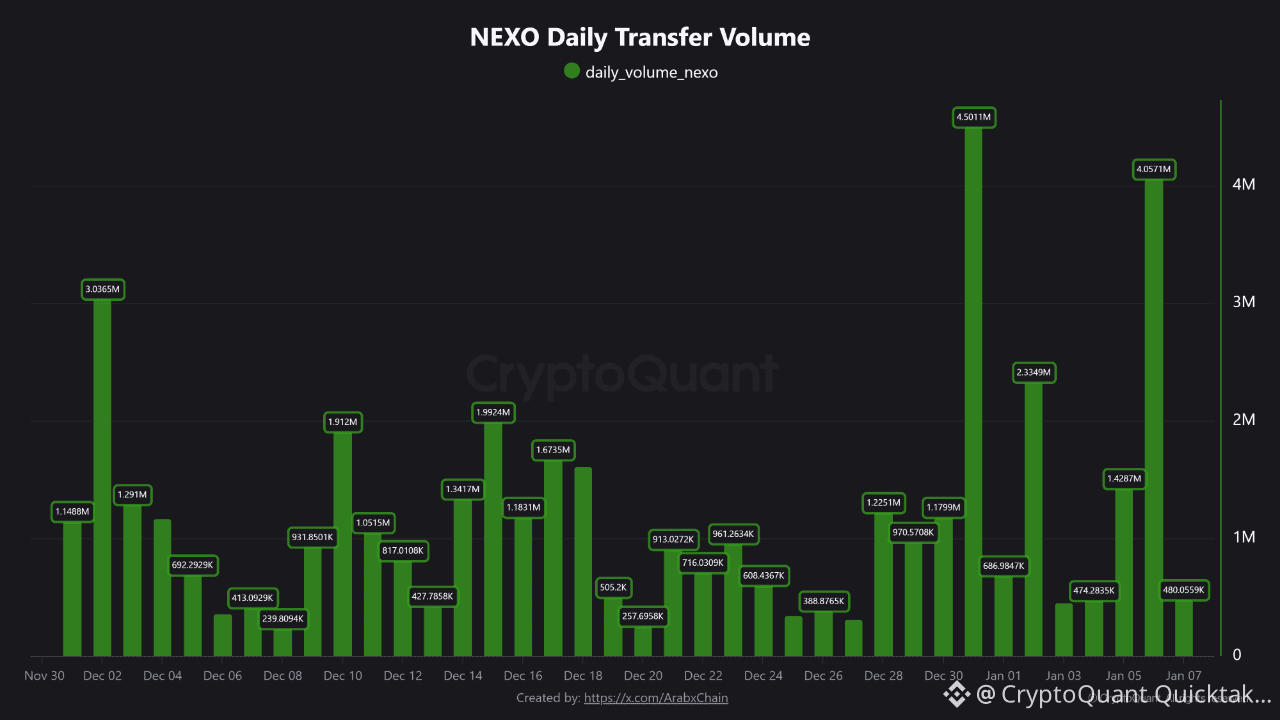 As December progressed, a more consistent pattern emerged, with recurring peaks between 1.3 and 2 million NEXO. This reflects a gradual increase in the token’s use for both transactional purposes and liquidity management. Such behavior often indicates rising confidence or anticipation of larger market movements.