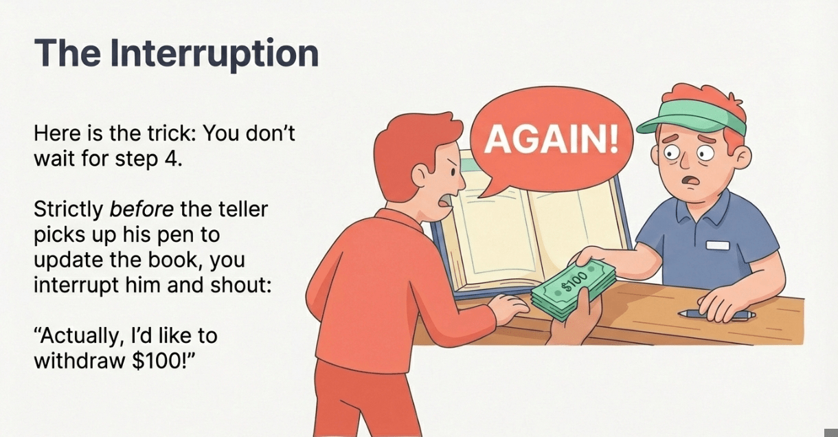 Você continua interrompendo-o antes que ele possa escrever, drenando todo o cofre do banco, enquanto o saldo da sua conta no papel permanece perfeito.