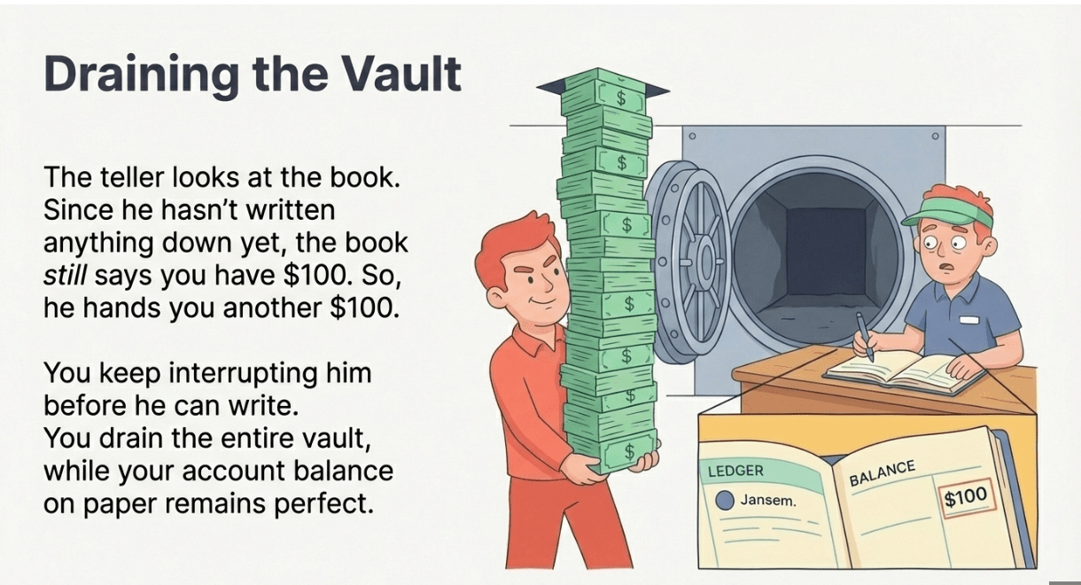 Esse "Glitch do Dinheiro Infinito" é um Ataque de Reentrância.