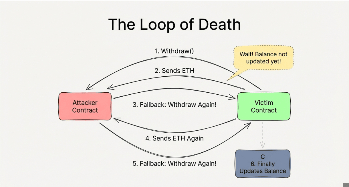 Um atacante escreve um contrato malicioso que automaticamente grita "Retire novamente!" no milissegundo em que recebe o dinheiro. Como o contrato principal ainda não chegou à etapa 2 (Atualizar Livro), ele pensa que o usuário ainda tem fundos e envia o dinheiro novamente. Ele repete esse processo até que o contrato esteja vazio.