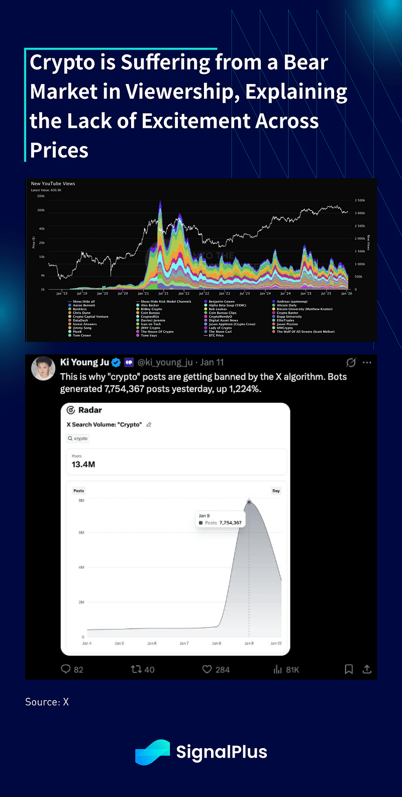 Fora dos preços, a audiência e a empolgação em torno das criptomoedas diminuíram de forma mensurável, com a média de 30 dias de visualizações de conteúdo cripto no YouTube caindo para os níveis mais baixos desde janeiro de 2021, enquanto o X também começou a limitar e filtrar conteúdo relacionado a cripto devido a um influxo de bots.