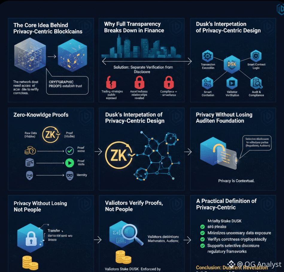 A privacy-centric blockchain, in its most practical form, is not about secrecy for its own sake. It is about controlling information exposure while preserving trust. Dusk fits into this category not because it hides everything, but because it redefines what must be visible and what does not.