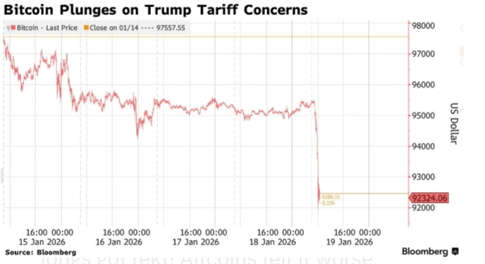 Oi família Binance Square! Aqui está seu resumo diário rápido de cripto em meio a alguma volatilidade. Os mercados estão reagindo às notícias macro, mas as vibrações de longo prazo permanecem otimistas para muitos. Vamos mergulhar: Bitcoin ($BTC ) cai abaixo do suporte chave → Atualmente pairando em torno de $92.500–$93.000 após cair de máximas próximas a $97k. As novas ameaças tarifárias de Trump sobre países europeus (ligadas a disputas na Groenlândia) abalaram os ativos de risco, desencadeando liquidações maciças — mais de $790–$875 milhões eliminados nas últimas 24 horas! BTC estabilizou hoje, mas se prepara para mais conversas turbulentas sobre a guerra comercial de Davos.